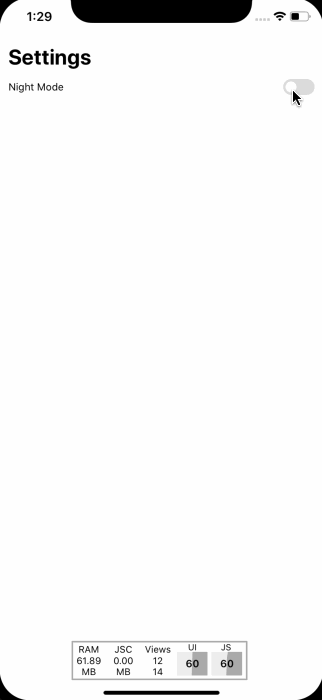 <Div bg="body" flex={1} px="lg">        <Text mt="2xl" pt="xl" fontSize="5xl" color="text" fontWeight="bold">          Settings        </Text>        <Div row mt="md">          <Div flex={1}>            <Text color="text">Night Mode</Text>          </Div>          <Div>            <ThemeSwitcher />          </Div>        </Div>      </Div>    </ThemeProvider>